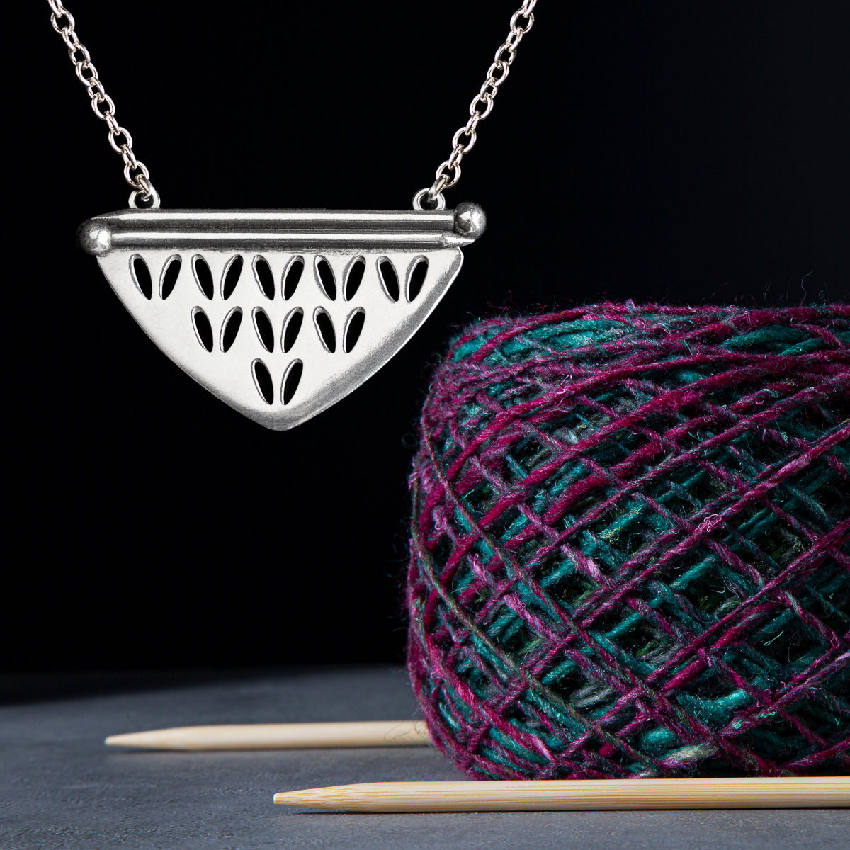 Shawl WIP, Knitting Needles, and Stockinette Motif Necklace in Sterling Silver with adjustable chain.