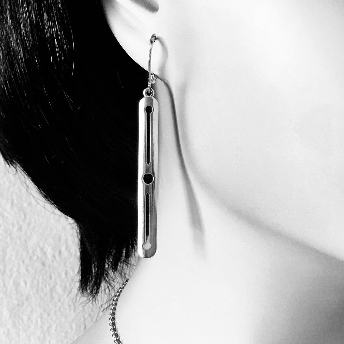 Porterness Studio Long Knitting Needle Motif Earrings are light and hang on lever back ear wire to ensure they don't get lost.