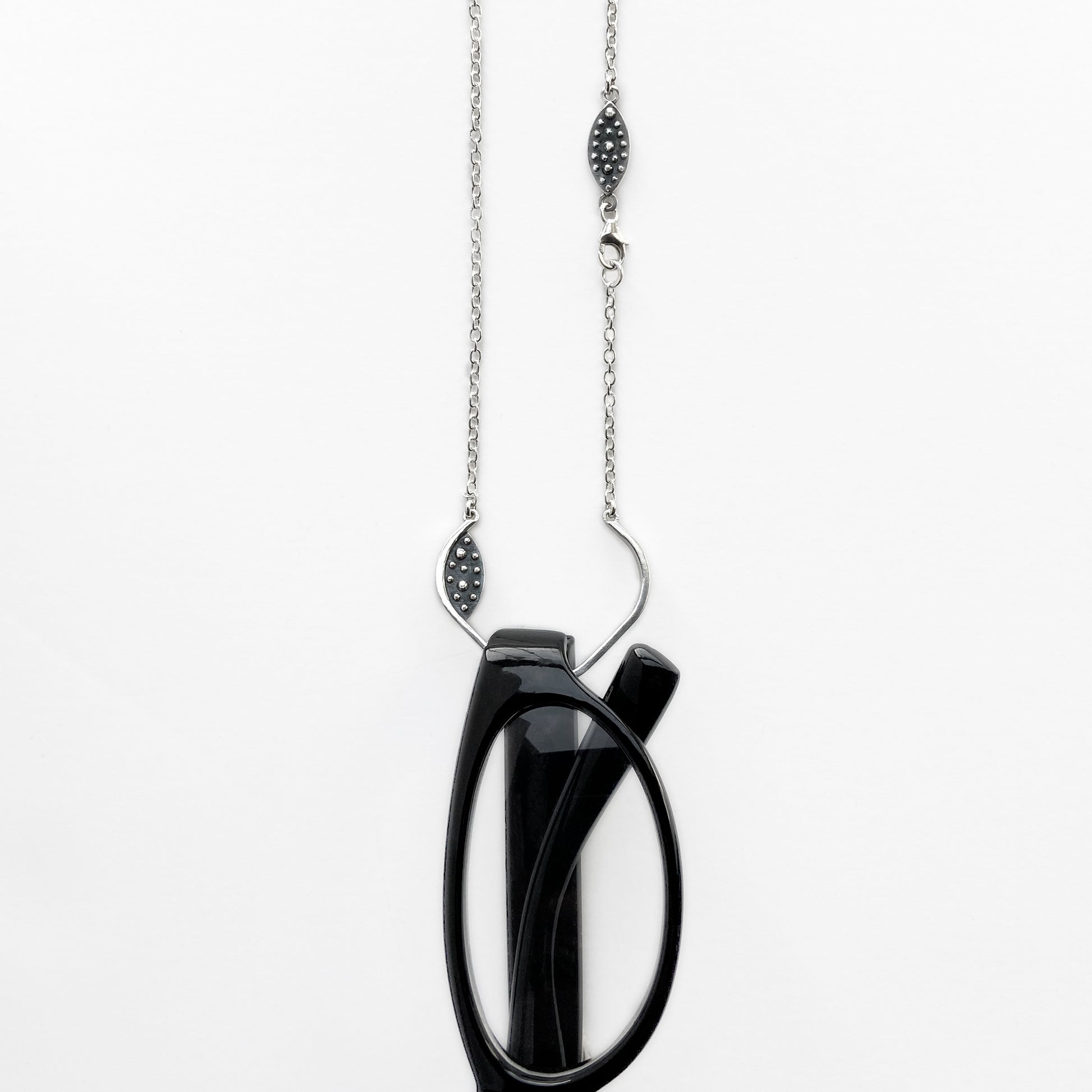Keep your stitch markers in one place and your style on point! There are two claps, one in the back and one in the front for easy stitch marker access. The necklace comes with 5 sterling silver stitch markers. Also the neckless was designed to hang your reading glasses on.