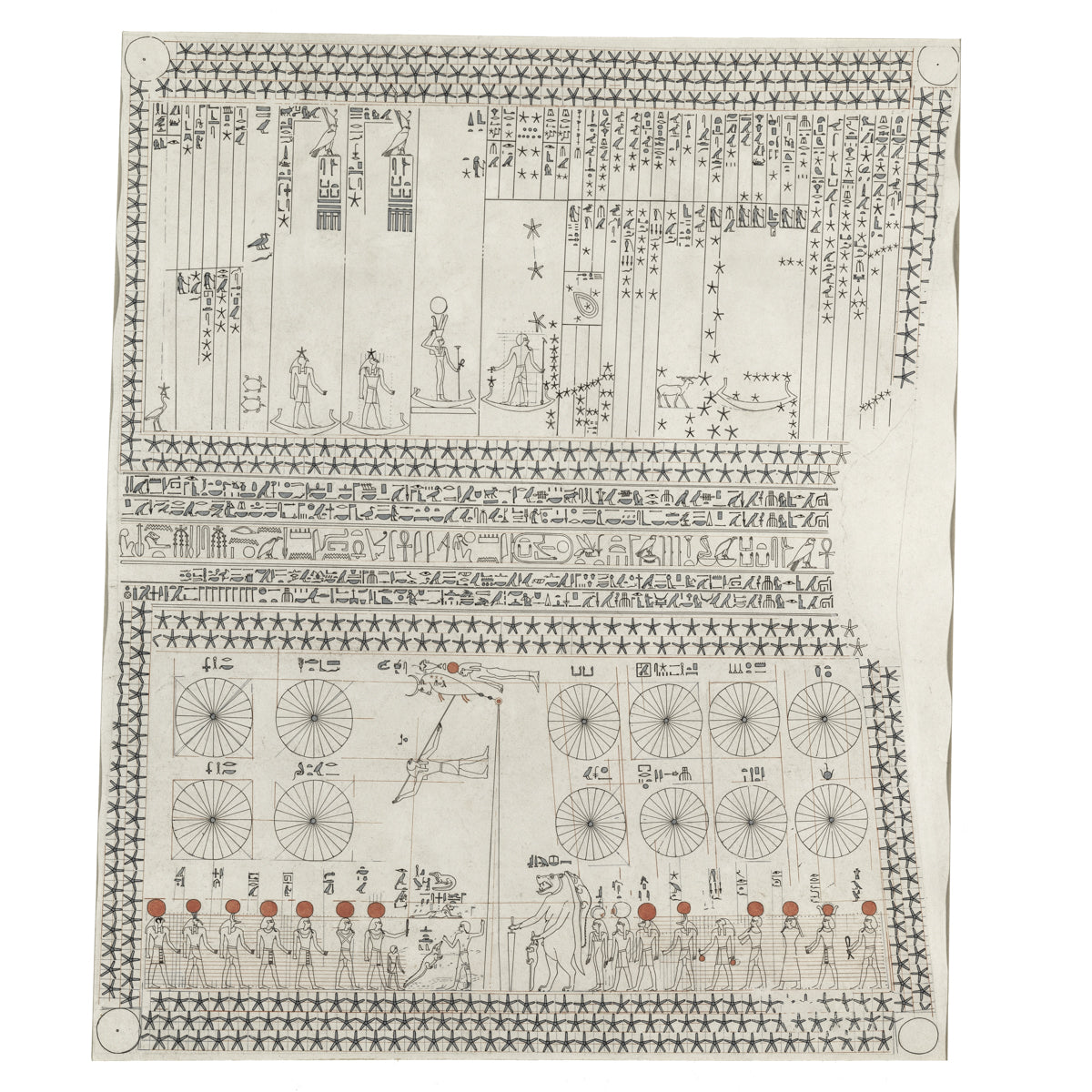 The ancient Egyptians were dedicated astronomers, as illustrated by this schematic guide to the night sky that decorated a ceiling in the tomb of Senenmut at Deir el-Bahri. The figures represent constellations or protective deities, and the columns of text in the upper part list planets and stars known as the decans. The twelve circles in the lower part, each divided into twenty-four segments for the hours of the day and night, are labelled with the names of the months of the year.