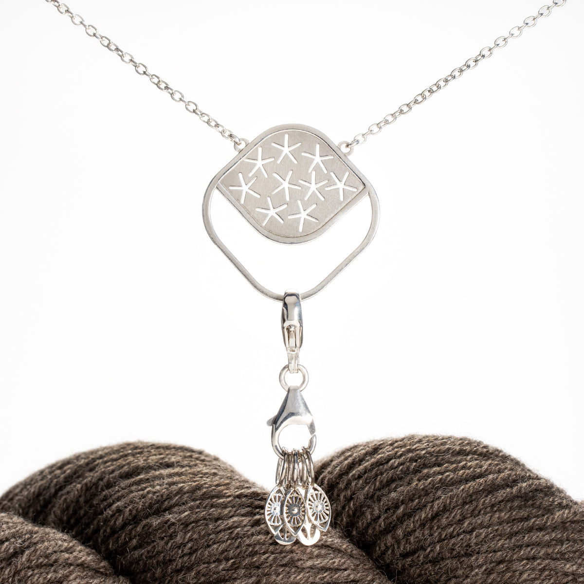 Keep your stitch markers in one place and your style on point! The stitch marker lobster claw holder can be totally removed to wear the necklace without the markers. The necklace comes with 5 sterling silver stitch markers.
